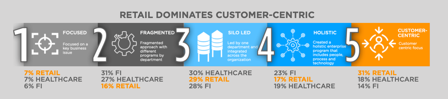 Retailers are farther along compared to FI and Healthcare in initiatives that focus on the customer experience.